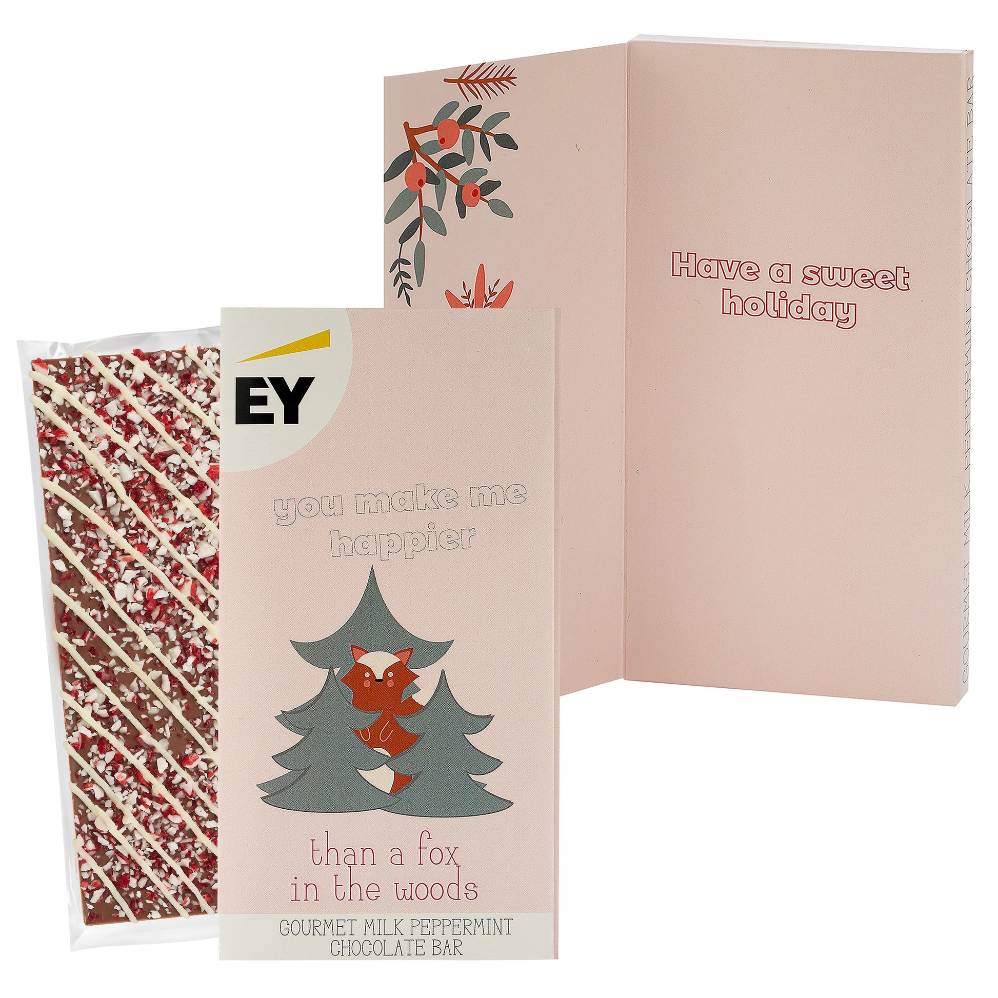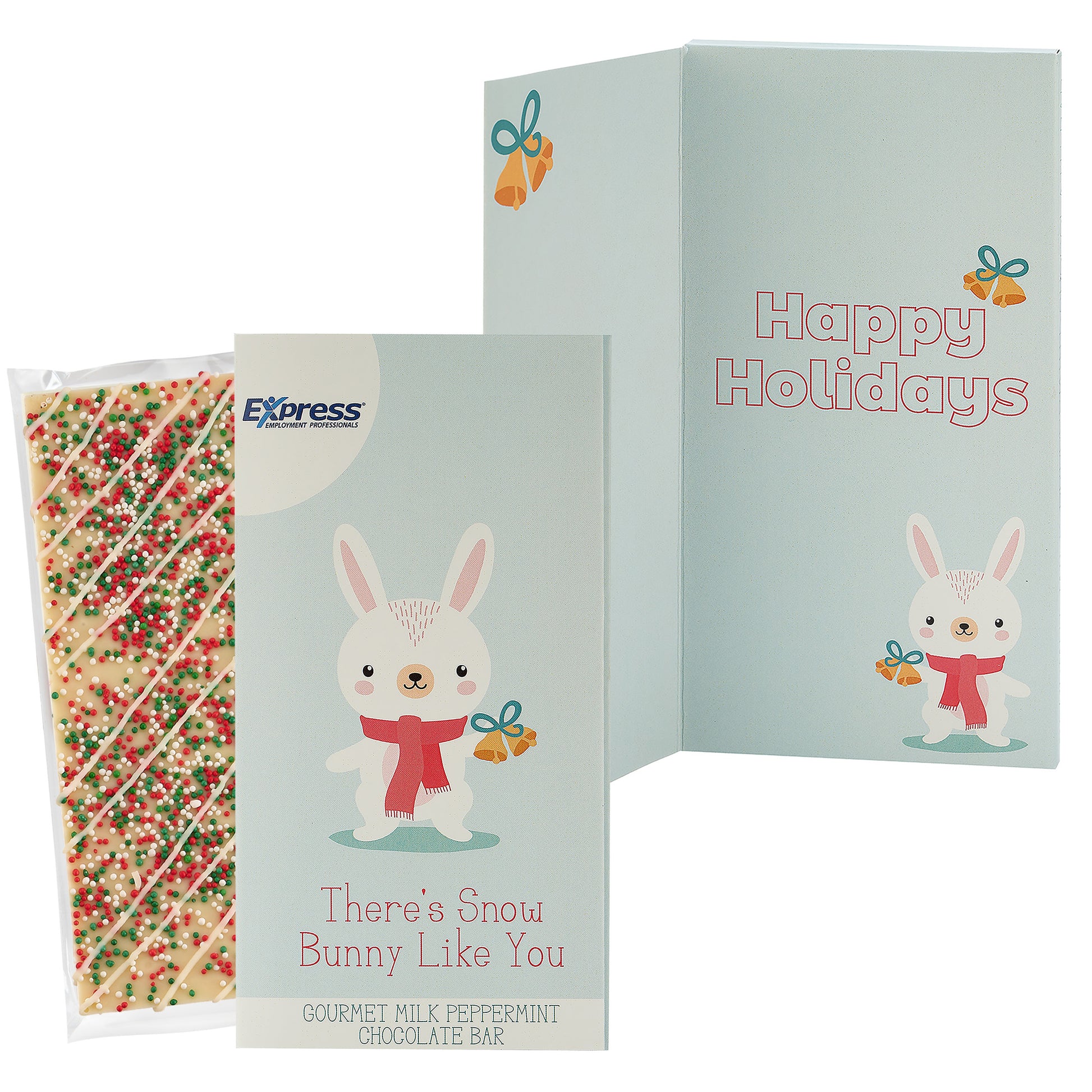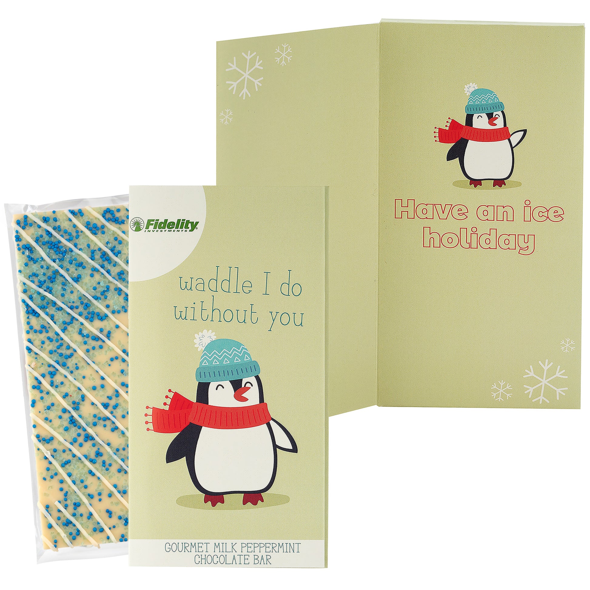 Bring on the tidings of joy with our new 3.5 Belgian Chocolate bar collection featuring whimsical and fun sentiments! Simply add a logo to any of our stock design boxes shown! Feeling creative? Create your own custom box and wording! Choose from 4 festively flavored Chocolate bars!