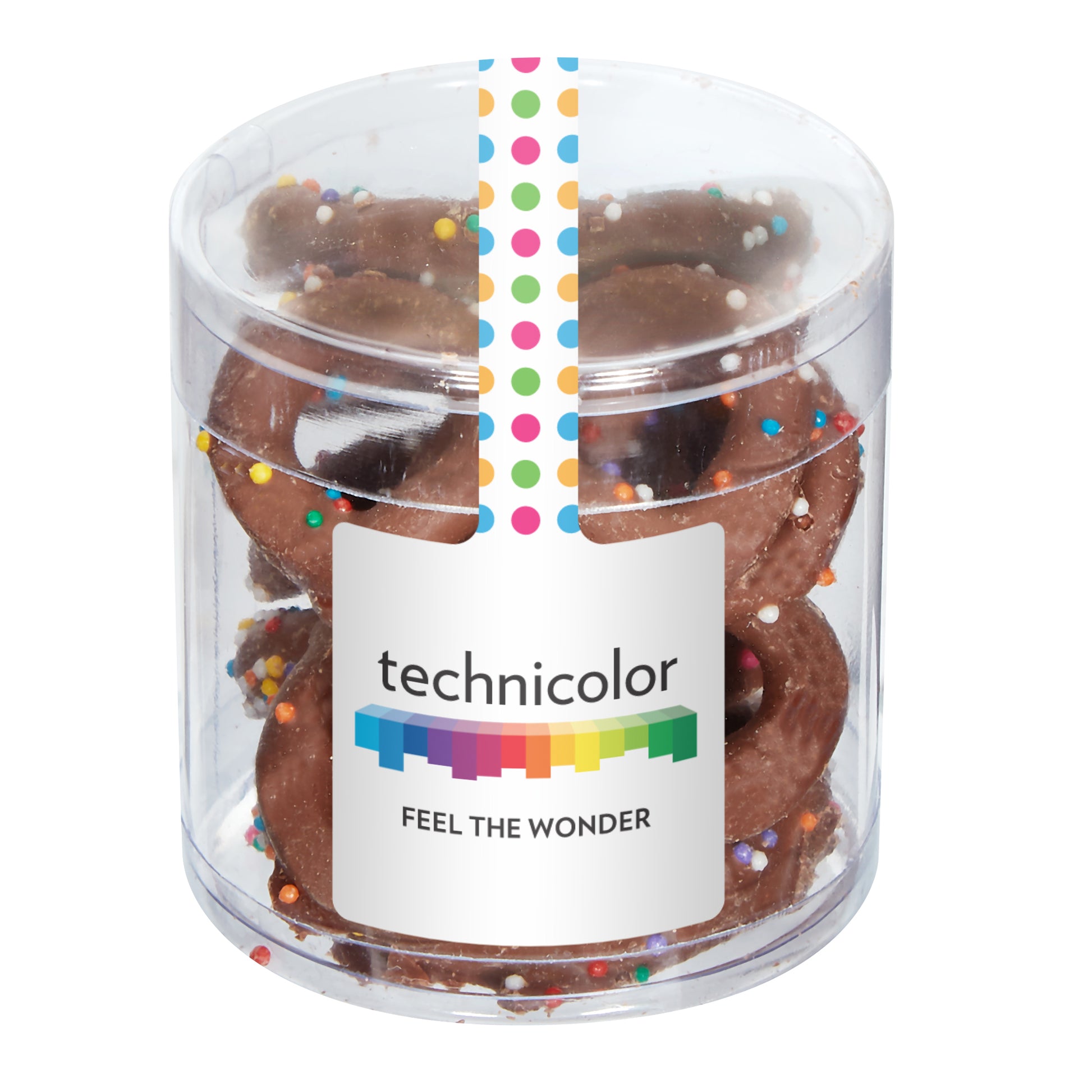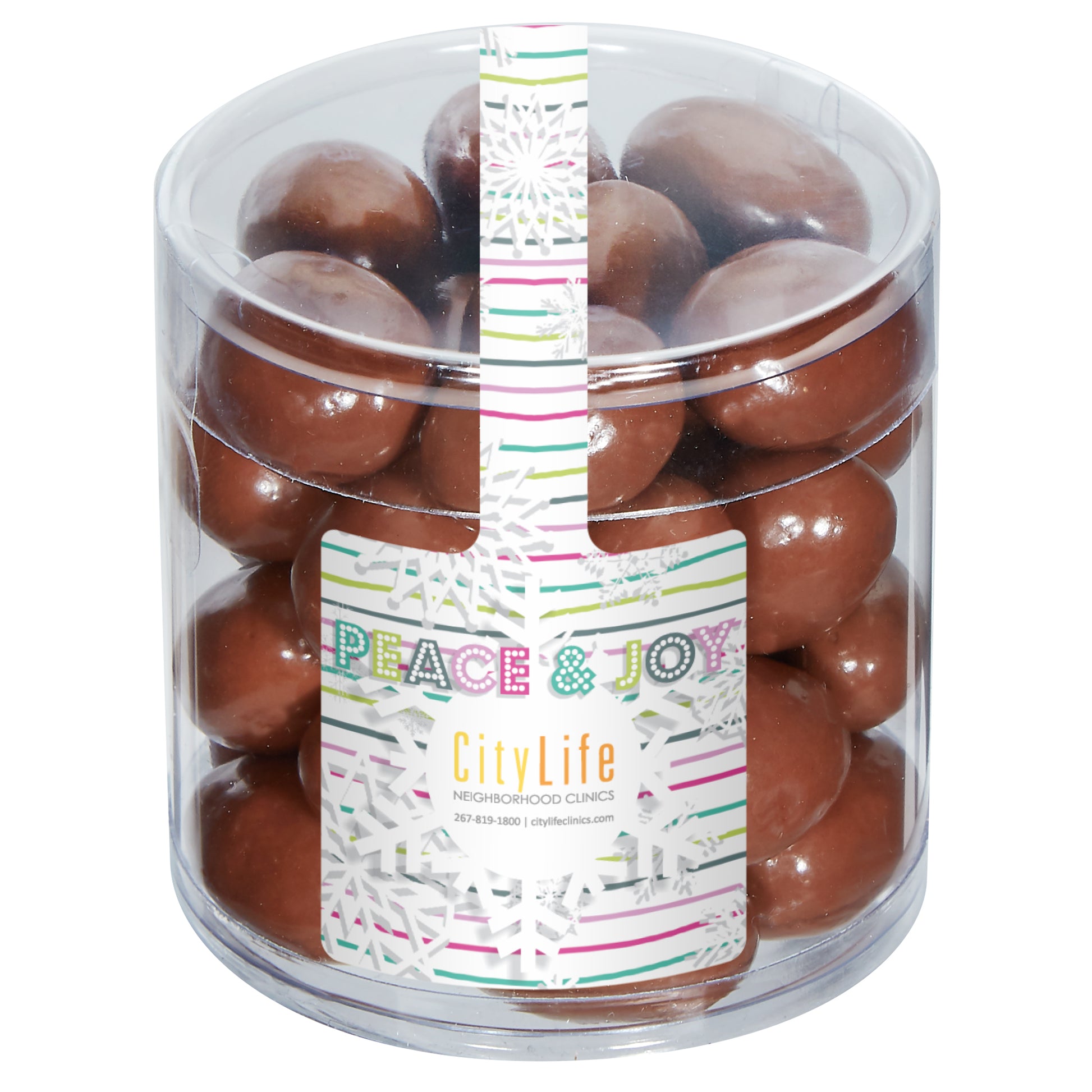 A stylish, gift-ready clear cylinder filled with your choice of sweets or snacks. Fully customizable with a 4-color process label (round or square) for maximum branding impact. Perfect for giveaways, welcome kits, and client leave-behinds.