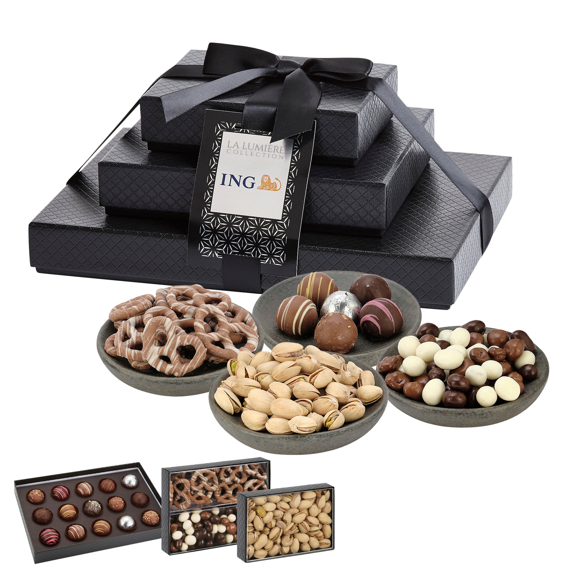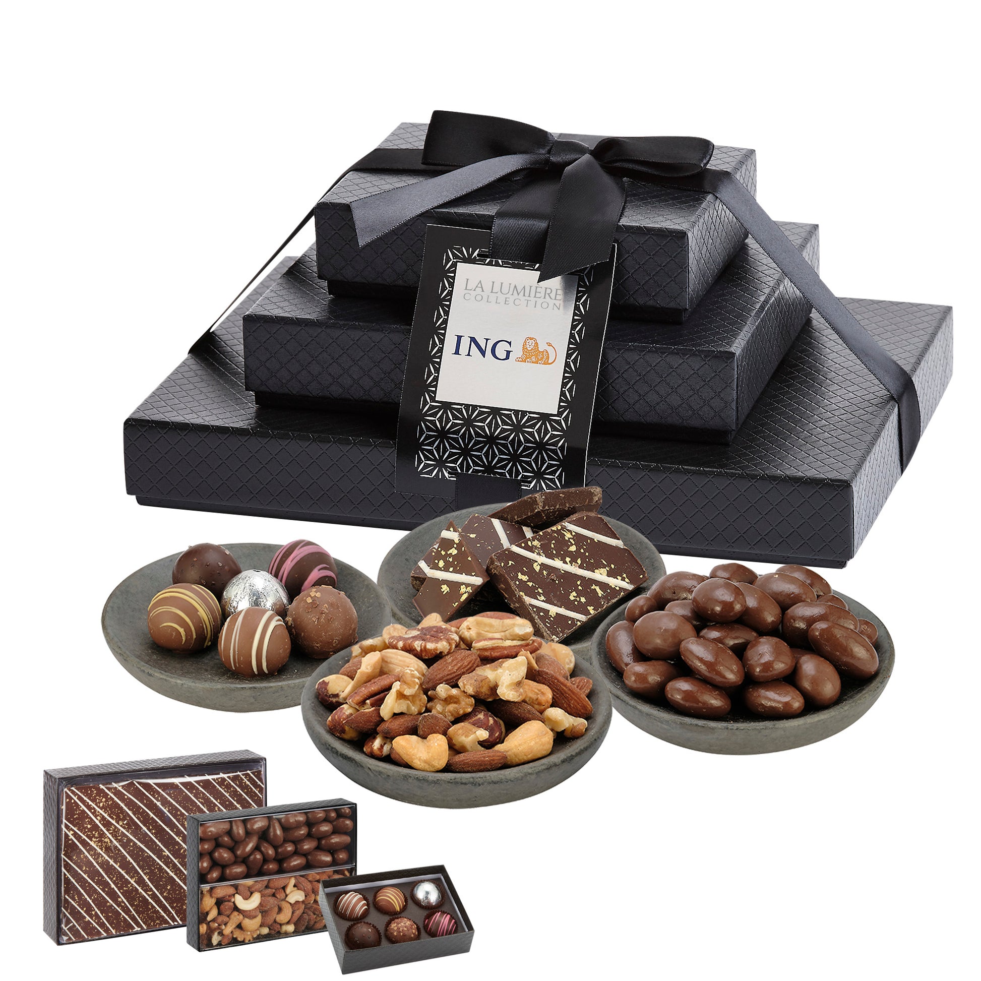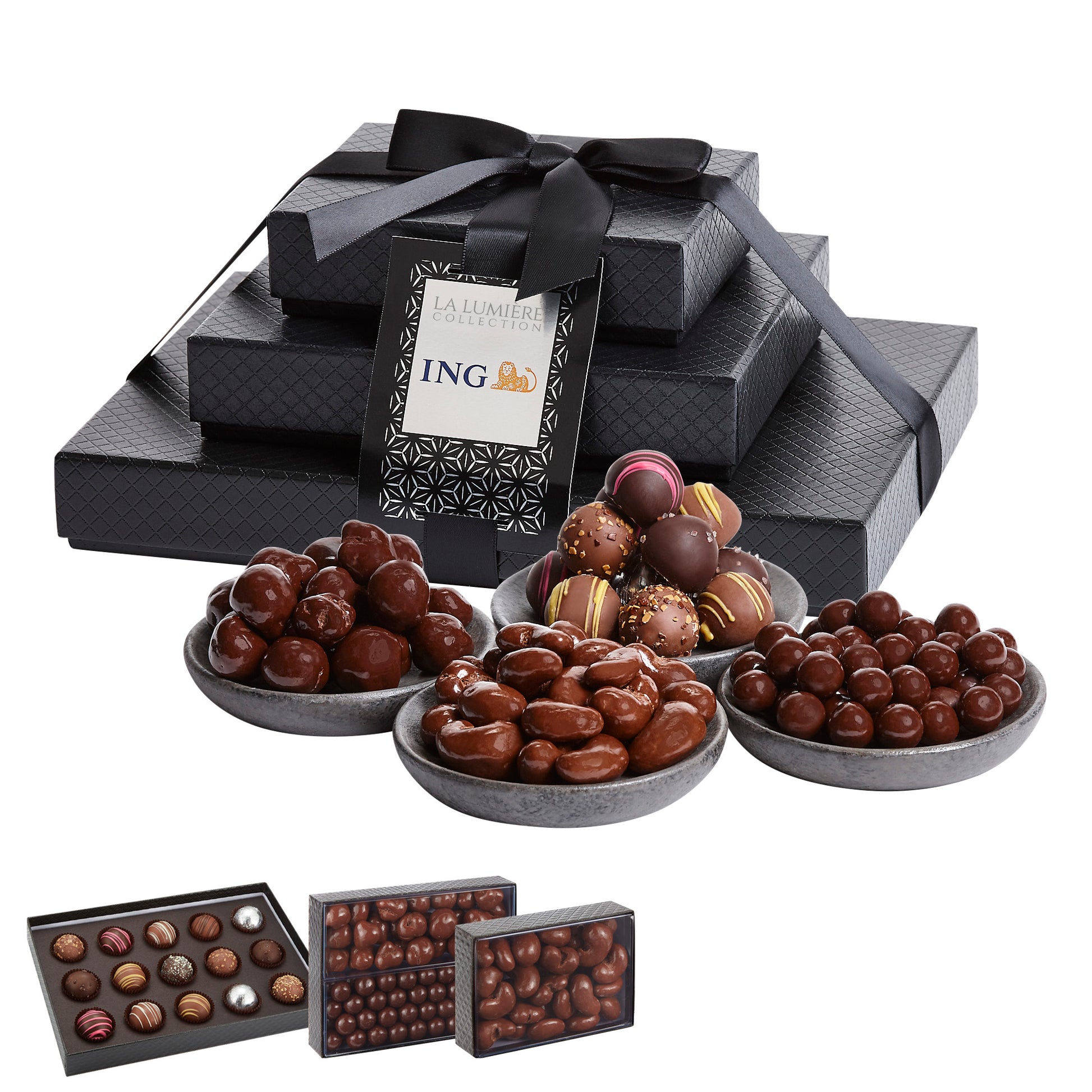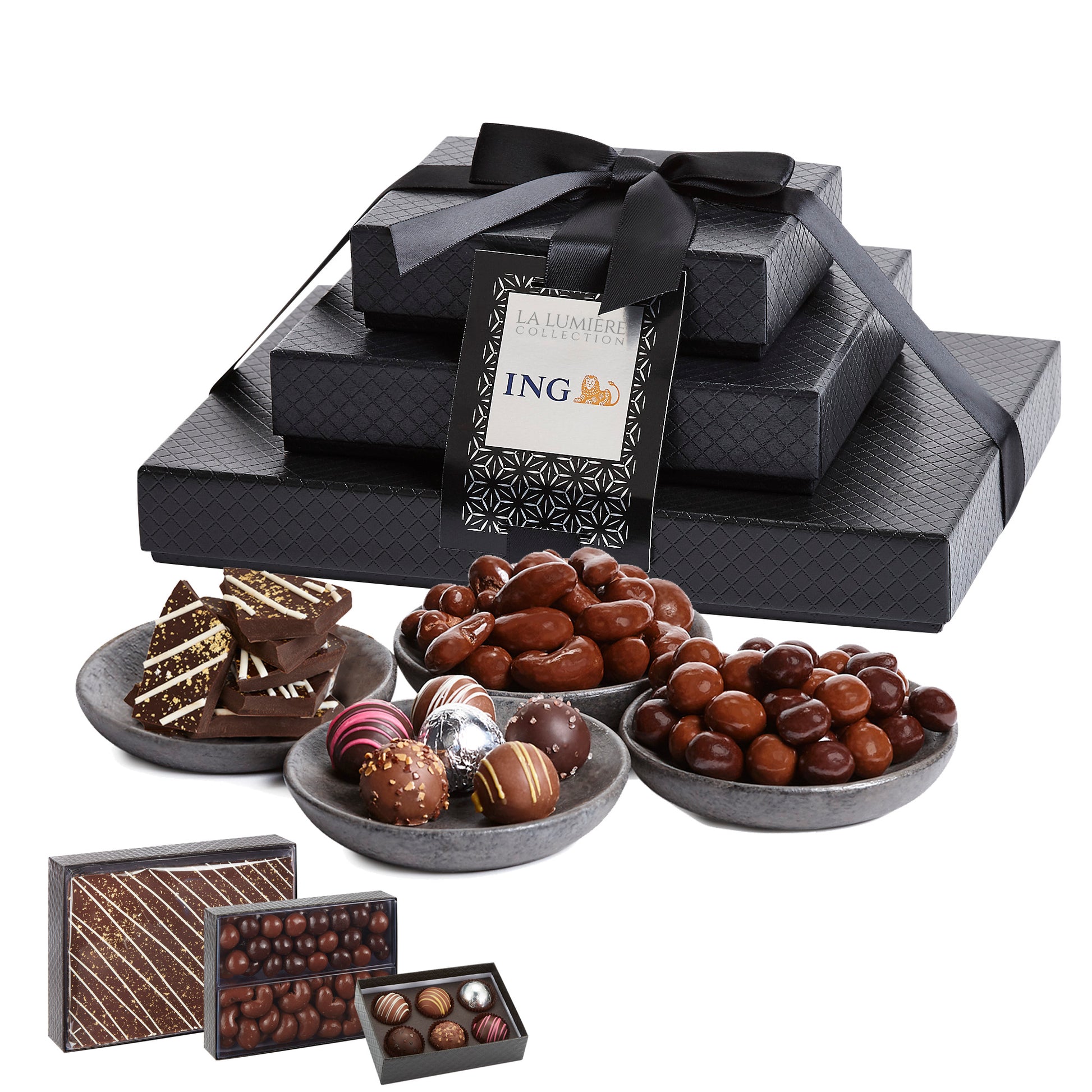 Senior Suite Stackers — La Lumiere pairs gourmet chocolates and candies with luxe metallic paper and soft-touch finishes for an elevated gifting moment.